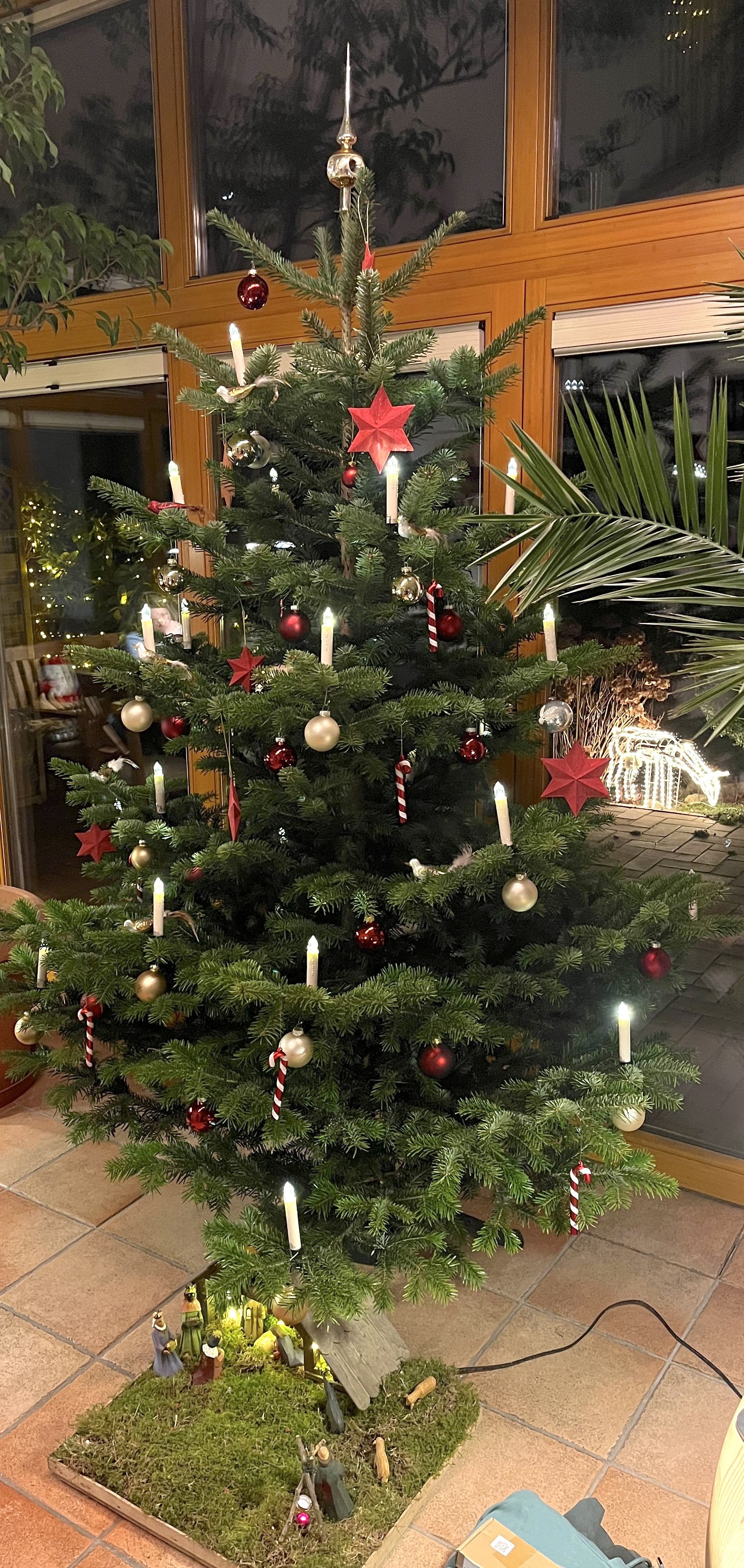 Papa und ich haben eine Fahrradtour gemacht. Und dann sind wir mit dem Fahrrad nach Platjenwerbe und haben den Weihnachtsbaum geholt. Aber es war sehr schwierig, ihn auf dem Fahrrad zu transportieren, weil der Weihnachtsbaum immer öfter runter gerutscht ist vom Fahrrad. Aber wir haben es geschafft, den Weihnachtsbaum nach Hause zu bekommen. Nächstes Jahr holen wir den Weihnachtsbaum wieder mit dem Auto ab. Und der Weihnachtsbaum sieht in diesem Jahr wieder sehr schön aus und hat Glitzer-Sterne bekommen. Die Krippe hat echtes Moos bekommen.