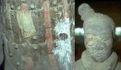 Die Terrakotta-Krieger von Lintong (China) sind archäologische Funde, die eine Fassung (Bemalung) aus natürlichen organischen Polymeren mit und ohne Farbpigmenten tragen. Diese Farbschichten beginnen sich bei Austrocknung sofort von der Oberfläche abzurollen.
