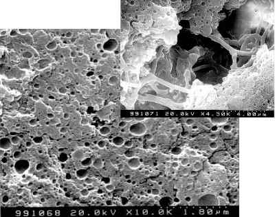 ![]() Die nanometerfeine Porenstruktur des Qi-Lackes wird erst bei höherer Vergrößerung (hier 10.000fach) deutlich. Größere Risse und Ablösungen können mit Klebstoffen (wie Fischleim oder Polyurethan) überbrückt undf gefestigt werden. (oben rechts> |