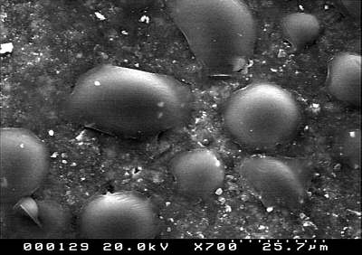 Bei den Versuchen in der Klimakammer stellte sich heraus, dass mit zunehmender Luftfeuchtigkeit das hygroskopische Polyethylenglycol tröpfchenweise aus der Oberfläche wieder heraustrat. Mit Hilfe der Kryofixierung während des Versuches und anschließender Untersuchung im Rasterelektronenmikroskop konnte dieser Prozess visualisiert und analysiert werden.