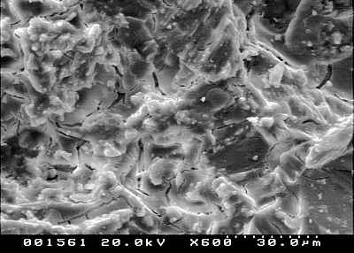 Typisches Profil der Gipskruste über einer Hohlstelle (Blase): An der Außenseite (im Bild links) haben eng verwachsene Gipskristalle ein dichtes Gefüge gebildet. Dahinter befindet sich ein poröses, lockeres Gefüge aus überwiegend tafeligen Gipskristallen. (REM-RE-Aufnahme) |