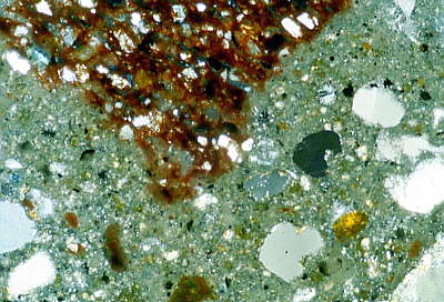 ![]() In diesem Beispiel führte die richtige Vornässung der Recyclingzuschläge und die anschließende Mischzeit (5 min) zu einem dichten, feinfaserigen Bindemittelgefüge um die Zuschläge (hier ein rotes Ziegelkorn) herum, erkennbar an dem unscharfen Saum. |