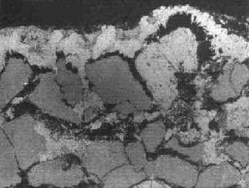 Die entlang der gereinigten und ungereinigten Oberflächen auftretenden Rißbildungen deuten auf eine reinigungsunabhängige Schädigung des Gefüges hin, ein Einfluß durch die Reinigung ist nicht nachzuweisen. Als Ursache der Schädigung sind vielmehr bearbeitungs- und verwitterungsbedingte Veränderungen der Oberflächenbereiche anzunehmen. Derart angelegte Schwächezonen werden infolge der Eissprengung aufgeweitet und somit sichtbar. In Zwischenschichten von Kaolinit eingelagertes Wasser fördert beim Gefrieren die Zerstörung des Kornverbandes.
