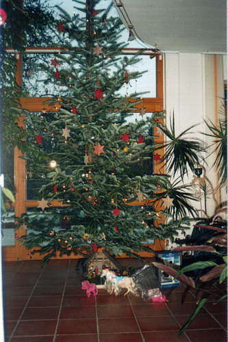 Unter dem riesengroßen Weihnachtsbaum stehen meine Barbie-Pferde.