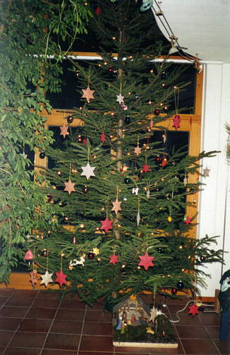 Dieser Baum war groß und schlank mit vielen bunten selbstgemachten Sternen. Die Krippe hatte auch elektrische Beleuchtung.