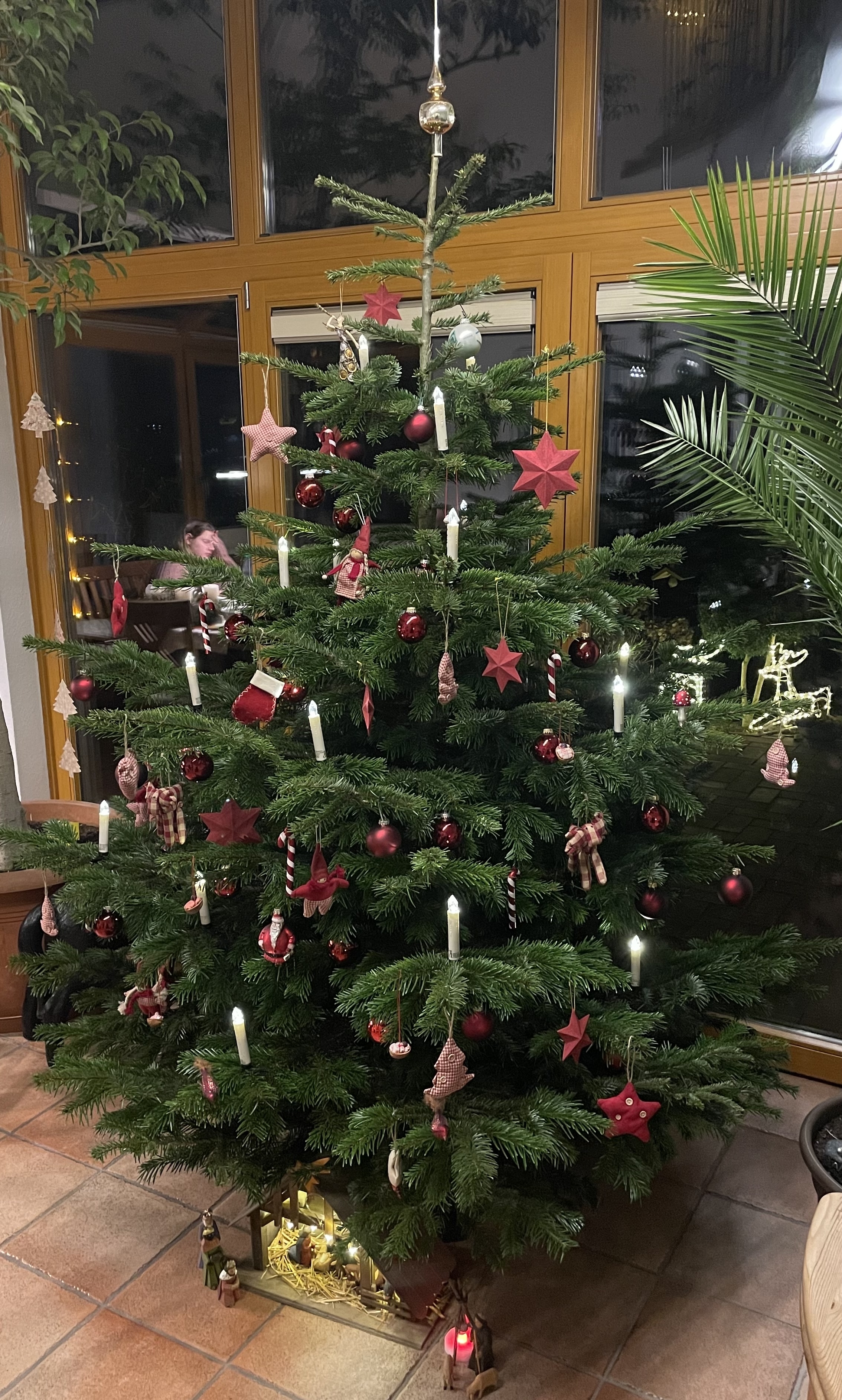 Ich habe mit meiner Familie den Weihnachtsbaum aus Garlstedt geholt, beim Bauern unseres Vertrauens. In diesem Jahr ist der Weihnachtsbaum sehr schön geschmückt. Mit Rot und ein bisschen Gold. Es gab am 1. Weihnachtsabend eine kleine Weihnachtspute. In unserem Elternhaus.