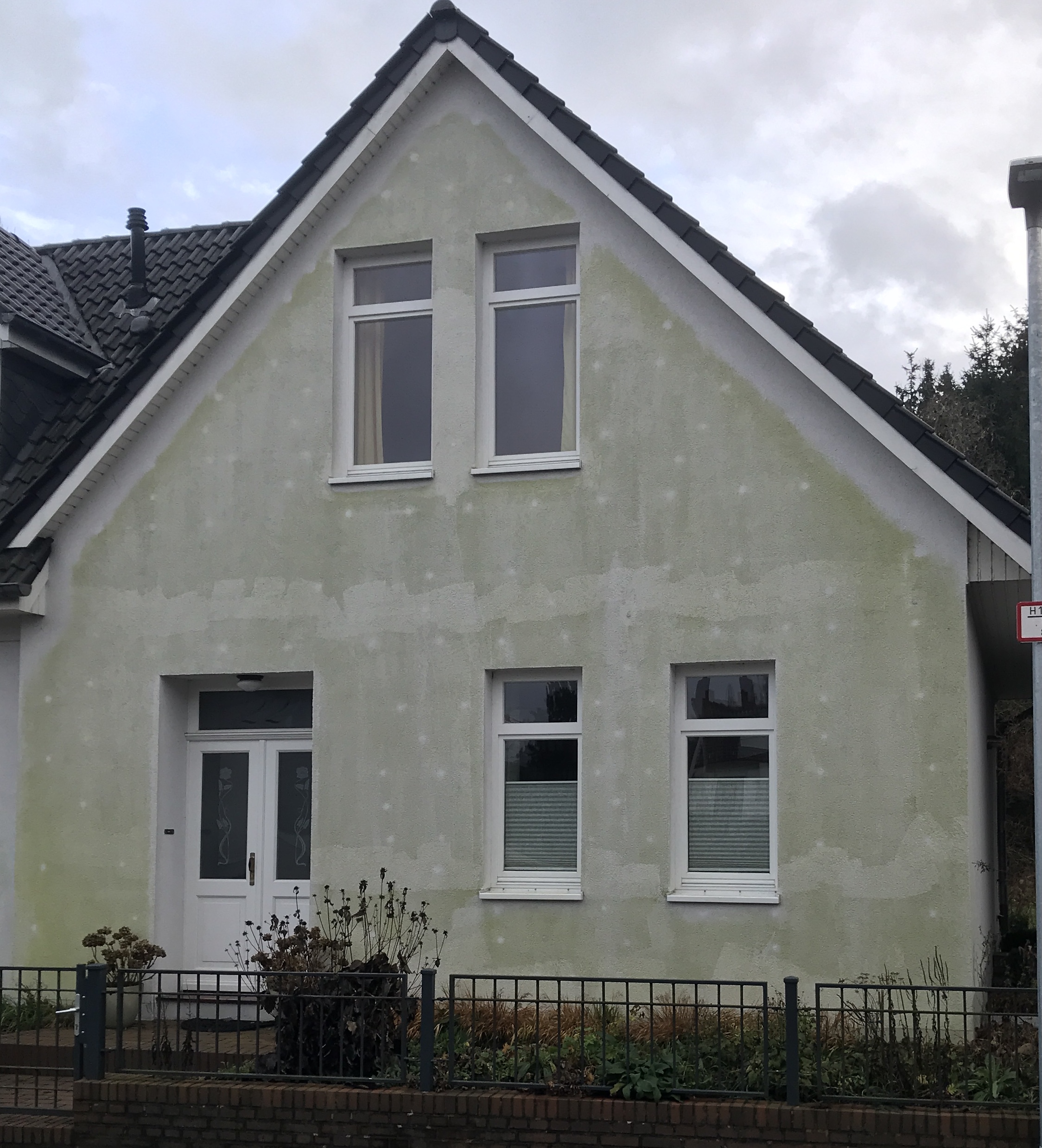 Hier ist ein besonders interessantes Beispiel gezeigt. Dort, wo der Regen auf die Fassade fällt, ist eine massive Vergrünung durch Algen eingetreten. Unter dem Dachvorstand bleibt die Fassade trocken, wodurch das Wachstum der Algen behindert wird. Algen brauchen Feuchtigkeit, und die bietet offenbar die einmal befeuchtete Fassadenoberfläche in ausreichendem Maße. In Trockenzeiten sind Algen über längere Zeit in der Lage zu überleben. Sonnenstrahlung kommt nicht an die nach Norden zeigende Fassade, weshalb eine völlige Autrocknung des Putzes wohl nie richtig stattfiindet.