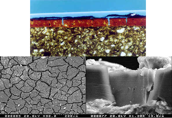 links: Rissmuster auf der Oberfläche einer HEMA-getränkten und mit Elektronenstrahl gehärteten Lackschicht | oben: Lichtmikroskopische Aufnahme des gerissenenen Lacks am Dünnschliff. | rechts: Die Risse gehen bis auf den Terracotta-Untergrund, die Haftung der Schicht bleibt allerdings erhalten. |