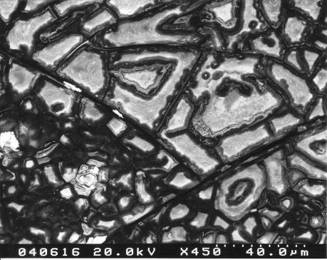 [REM-RE-Abbildung einer Glasuroberfläche] Geschädigte Oberfläche eines glasierten Ziegels. Es ist ersichtlich, dass die bleiarmen Bereiche (dunkel) rascher abgetragen werden als die bleireichen (hellen) Domänen. Durch die damit einhergehende Reliefbildung verliert die Glasur ihren Glanz. |