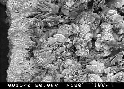 Typisches Profil der Gipskruste über einer Hohlstelle (Blase): An der Außenseite (im Bild links) haben eng verwachsene Gipskristalle ein dichtes Gefüge gebildet. Dahinter befindet sich ein poröses, lockeres Gefüge aus überwiegend tafeligen Gipskristallen. (REM-RE-Aufnahme) |