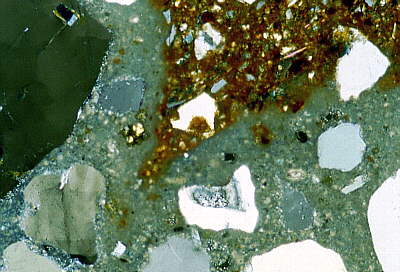 ![]() In diesem Beispiel führte die richtige Vornässung der Recyclingzuschläge und die anschließende Mischzeit (5 min) zu einem dichten, feinfaserigen Bindemittelgefüge um die Zuschläge (hier ein rotes Ziegelkorn) herum, erkennbar an dem unscharfen Saum. |