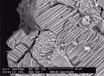 REM-Untersuchung einer Ziegeloberfläche mit dichter Salzkruste. Eng verwachsene Gipskristalle mit ausgeprägter Zwillingsbildung. Diese Formen sind hinter einer Ziegelschale enstanden. [REM-RE-Aufnahme] |