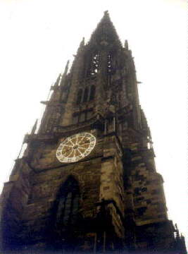 Das Münster in Freiburg, Blick vom Marktplatz auf den Turm. Deutlich sind bereits ausgetauschte (helle) Werksteine neben starkverschmutzten Quadern zu erkennen. |