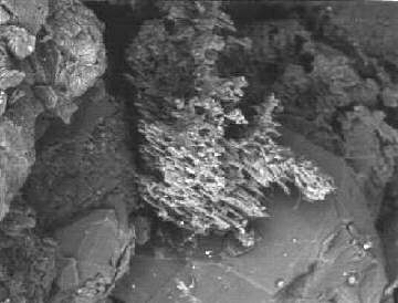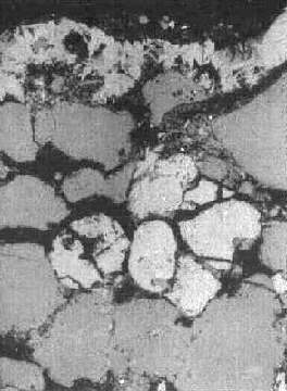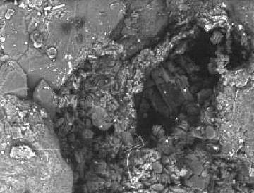 ![]() Bildbreite = 1,3 mm FE-REM Aufnahme eines Anschnitts aus dem Oberflächenbereich einer verwitterten Bausandsteinprobe aus dem aufgelassenen Steinbruch in Lahr. Auf der Außenseite des Sandsteins hat sich eine etwa 250 µm dicke Außenkruste gebildet, die im Gegensatz zur faserigen Innenkruste aus grobspätigem Gips besteht und den Porenraum nach innen abschließt. Der durch Frostsprengung gelockerte Kornverband wird zum Teil durch Gipsneubildungen sekundär stabilisiert. |