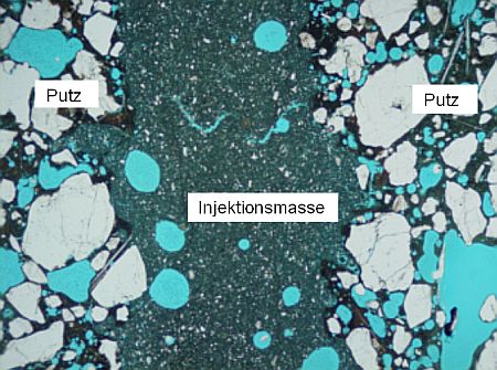 PolMi-Aufnahme, I Pol., Bildbreite 1,3 m Injektionsmasse in einer Putzhohlstelle. Das Material weist eine ausreichende Homogenität auf. Durch die optimale Flankenhaftung ist eine der wesentlichen Voraussetzungen für eine kraftschlüssige Verbindung zwischen den im Ausgangszustand voneinander getrennten Putzschichten erfüllt. |