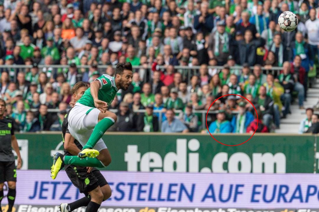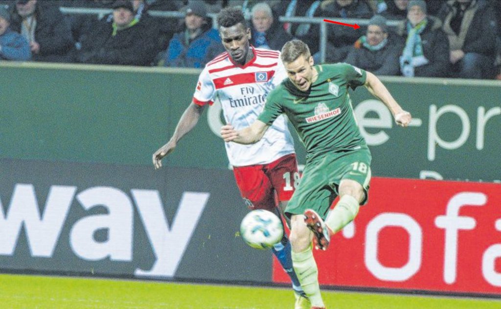 Am 24. Spieltag der Saison 2017/2018 hat Werder im Nordderby in letzter Minute mit 1:0 gewonnen. Natürlich war der Super-Fan wieder dabei (roter Pfeil) (Quelle: Kurier am Sonntag)