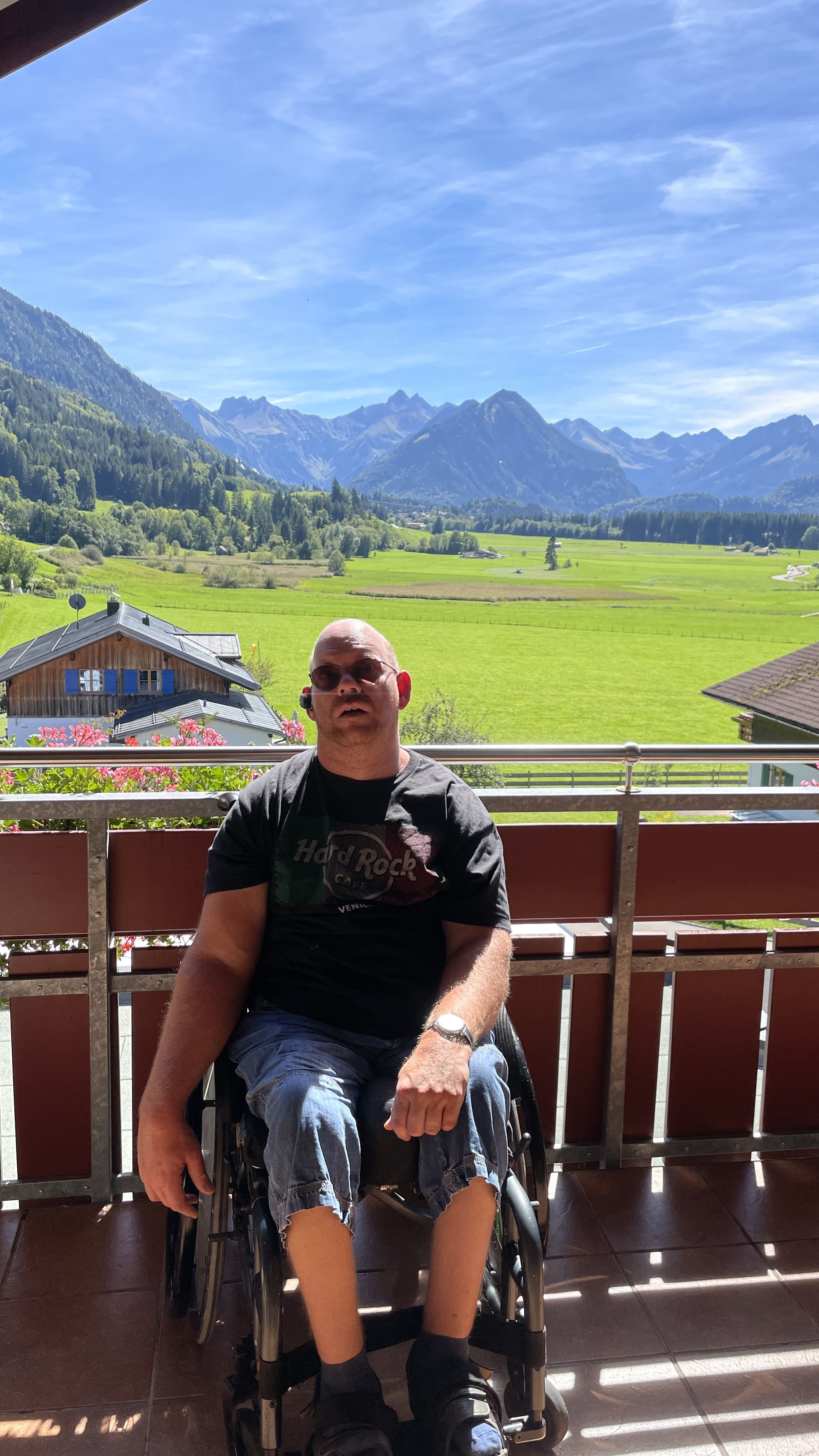 Auf dem Hinweg haben wir in Rotenburg o.d.T. übernachtet. Das Hotel Rappen liegt in der Innenstadt und ist für Rollstuhlfahrer gut geeignet. | In Oberstdorf sind wir ins Hotel Viktoria eingezogen. Hier sitze ich auf dem großem Balkon mit Blick auf die Berge. | In der Innenstadt von Oberstdorf haben wir einen Stadtbummel gemacht und die Skischanze gesehen. |