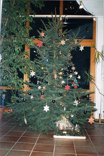 Hier haben wir den Weihnachtsbaum fotografiert, als es draußen schon dunkel war. Er war wieder etwas größer mit vielen Sternen.