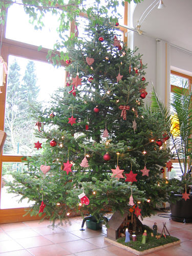 In diesem Jahr war der Baum ganz in rot geschmückt. Er stand vorher in Nachbars Garten. Die Krippe war wieder mit echtem Moos gebaut.