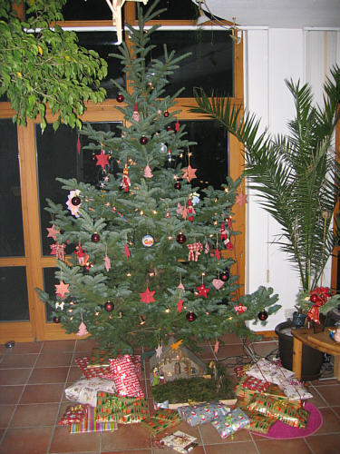 In diesem Jahr haben wir vom Bauern in Garlstedt eine Nobilis-Tanne bekommen. Hier sieht man darunter die Geschenke und die Krippe mit echtem Moos.