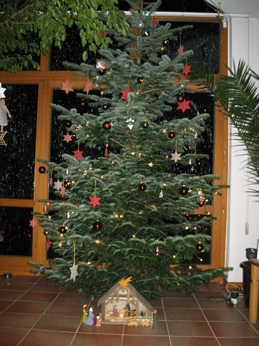 Eigentlich wollten wir die Spitze einer großen Tanne aus unserem Garten als Weihnachtsbaum nehmen, aber beim Fällen ist die Spitze abgebrochen. Deshalb haben wir wieder einen Baum aus Garlstedt geholt.