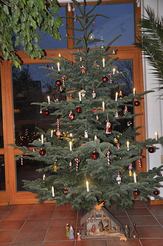 Im diesem Jahr sieht der Weihnachtsbaum wieder etwas anders aus. Er hat nämlich elektrische Kerzen mit Batterien bekommen. Auf die großen Sterne haben wir in diesem Jahr verzichtet. Es ist wieder eine Nobilis-Tanne aus Garlstedt.