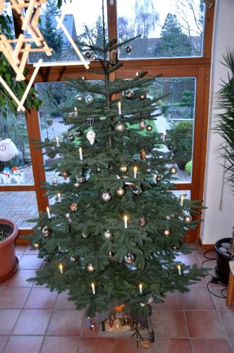 In diesem Jahr sieht unser Weihnachtsbaum anders aus als im letzten Jahr. Er hat nämlich goldene und silberne Kugeln dran.