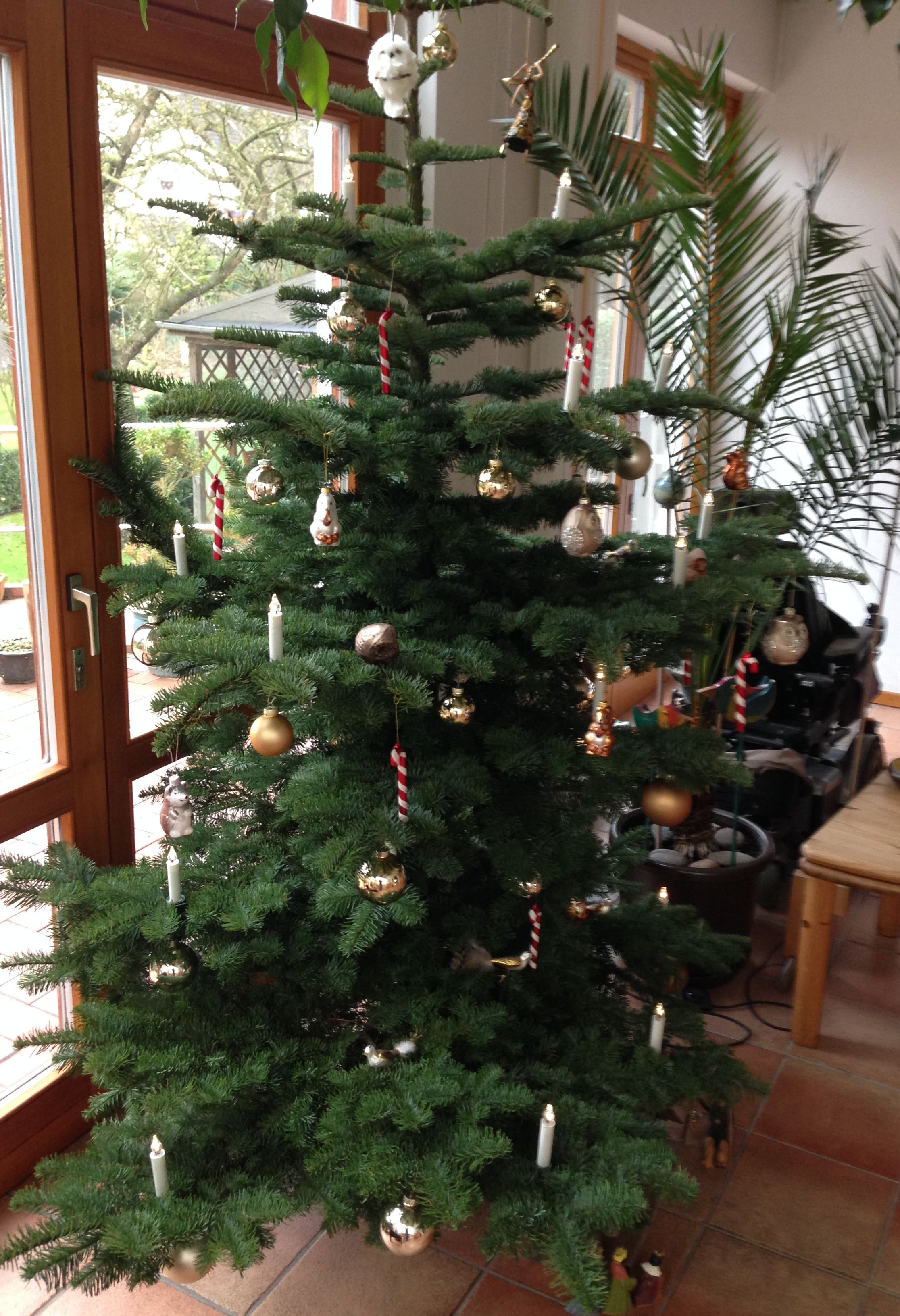 Am Weihnachtsbaum leuchten schon im dritten Jahr Kerzen mit Batterien, die sogar flackern.