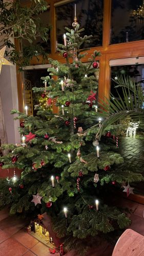 Es hat in diese Jahr so stark geregnet und gestürmt, dass ich nicht mitfahren konnte, den Weihnachtsbaum zu holen. Rechts hinten sieht man ein leuchtendes Rentier auf der Terrasse. Die Werder-Kugel ist etwas versteckt, kannst du sie finden?